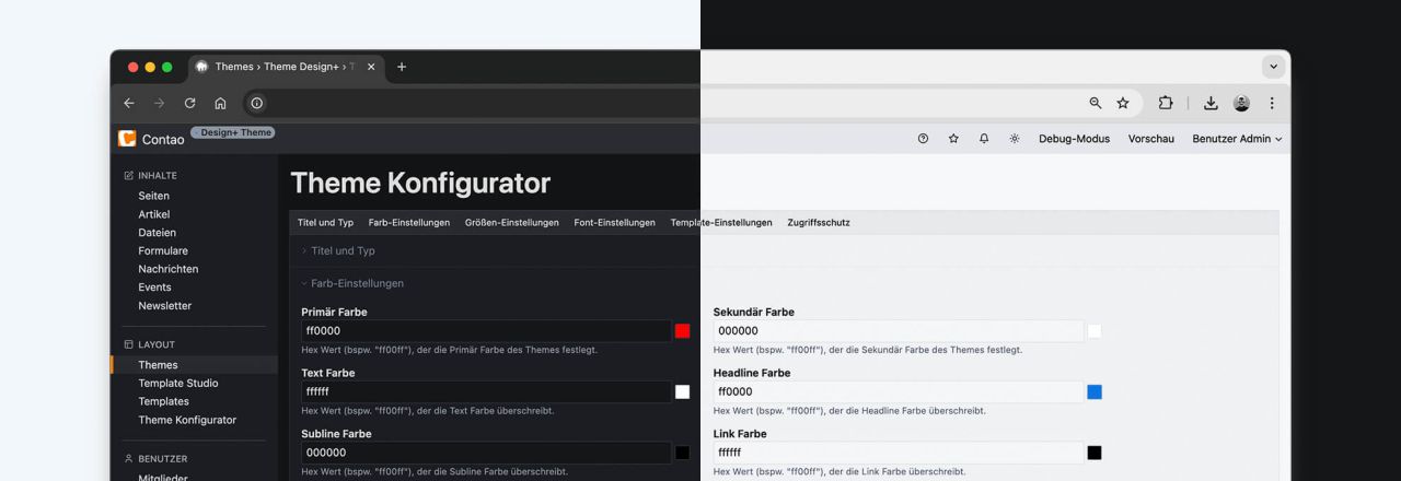 Contao Design+ wurde speziell dafür entwickelt, dir die individuelle Gestaltung deiner Website so leicht wie möglich zu machen – ohne komplexe CSS-Anpassungen oder Template-Eingriffe. Mit dem integrierten Theme Assistenten (ein exklusives Backend-Modul) und über 100+ designten Elementen kannst du dein Corporate Design, Layout und Seitenstruktur ganz einfach selbst definieren – visuell, modular, intuitiv.